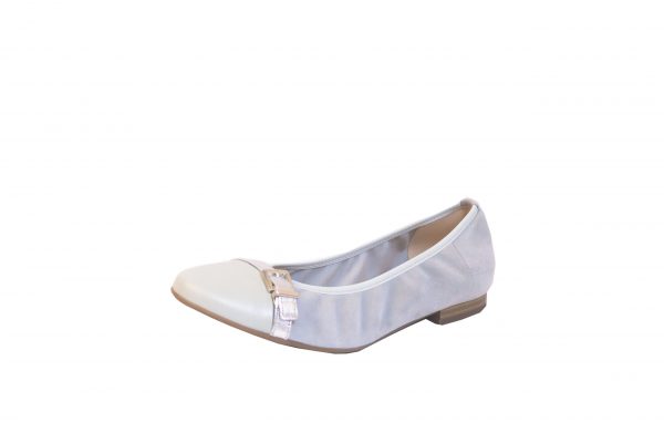 De kleur van deze ballerina nijgt naar een heel zachtblauw. Het bankje is zilverkleurig.